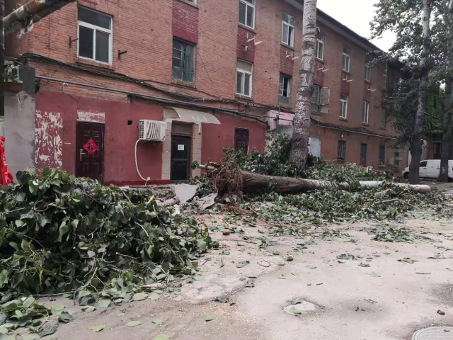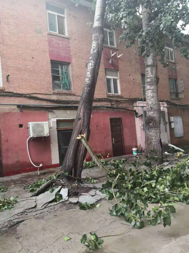 6月30日下午,突如其来的强对流天气给文化西路职工生活区带来较大破坏,多处树枝被大风刮断,散落地面;楼顶防水层被吹落地面;配电室高压桥架上被风刮断的树枝随时冒出火花,一旦出现短路,整个宿舍区都要停电,维修中心工作人员在电力局专业人员不能到现场情况下,通过电话指导,及时清理,避免了事故的发生。体育嘉苑3号楼前的一棵三十多米高的杨树被大风连根拔起,斜压在另一棵树上,随时有倒下的危险,树的南侧是老干部活动中心,7月1日将有百十名老干部集中在八楼会议室收看建党百年大会,树的西侧是1、2号楼,住户出行安全受到威胁。