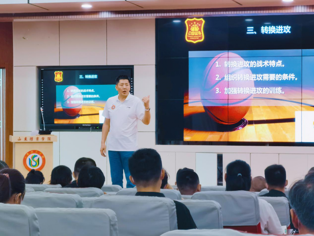 开班仪式结束后,山西汾酒男篮顾问、资深教练丁伟为大家来了第一个专题的授课,内容为篮球快速攻防转换训练,分为理论和实践两个部分。