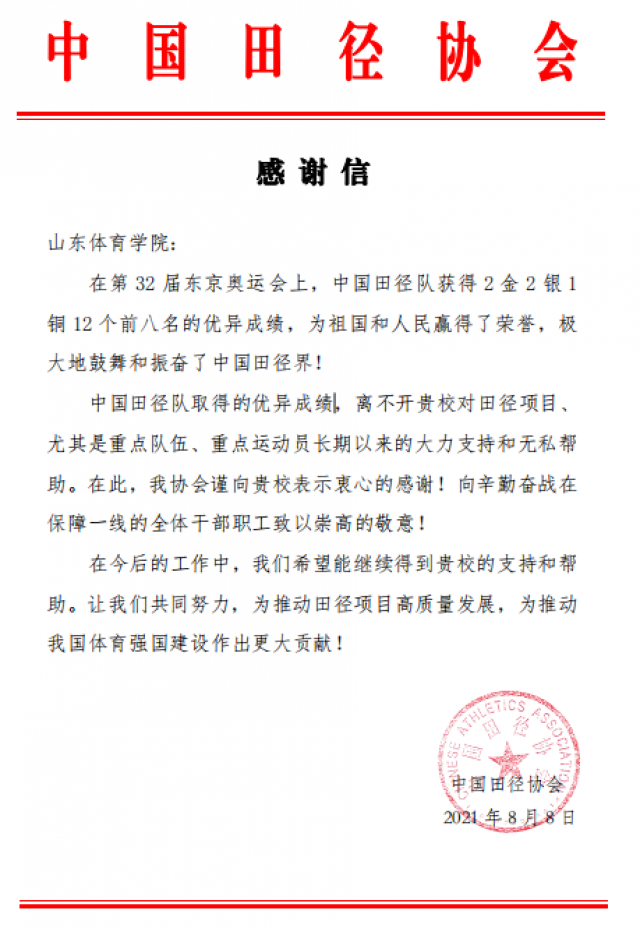 中国田径协会致信感谢山东体育学院