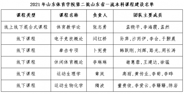 近日,山东省教育厅公布了第二批山东省一流本科课程认定结果。我校共有6门课程获批第二批山东省一流本科课程,其中线上线下混合式课程1门,线下一流课程5门。此外,《体育教学论》《运动生理学》《运动生物化学》3门课程被推荐参加国家级一流本科课程认定。