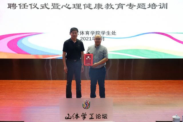 9月23日下午,学校在济南校区一号教学楼二楼报告厅举行山东体育学院校外心理辅导教师聘任仪式。校党委委员、副院长原维佳出席仪式,为李仁军颁发山东体育学院校外心理健康辅导教师聘书。