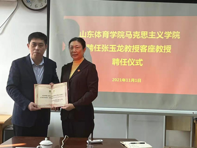聘任仪式结束后,张玉龙与我校马克思主义学院教师围绕如何提高思政课教学效果、创新思政课教学模式展开了交流研讨。他就滨州医学院医本思政、青年宣讲进行了介绍。他谈到,滨州医学院马克思主义学院通过组建“熠韶华”社团和“大学生时政宣讲团”,以“上接天线,下接地气”的方式有效提高了学生对思政课的兴趣,让学生真正深入社区、深入基层,充分利用线上线下相结合的方式,加强宣讲的“青年味”“思政味”“新鲜味”“生活味”“泥土味”,营造出关注思政、热爱思政、宣讲思政的校园氛围。他还对“体育”一词和体育院校思政课建设谈了自己的观点。他说,体育本质就是对身体的教育,而体育教育的核心归宿就是塑造人格,可以由此入手进行思政课程改革。