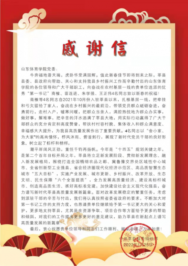 近日,我校收到中共莘县县委组织部为我校党委发来的感谢信。感谢学校始终贯彻落实省委组织部《关于持续选派第一书记和工作队抓党建促乡村振兴的通知》精神要求,在第五轮省派“第一书记”选派工作中,精心遴选商榷、苗连进、朱学强、王正伟4名同志派驻莘县王奉镇,并全力支持选派“第一书记”开展“抓党建促乡村振兴”各项工作。