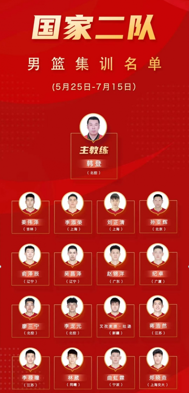近日,中国篮球协会公布了国家男篮二队集训人员名单,山东体育学院国家篮球学院2019级学生李龙元入选。