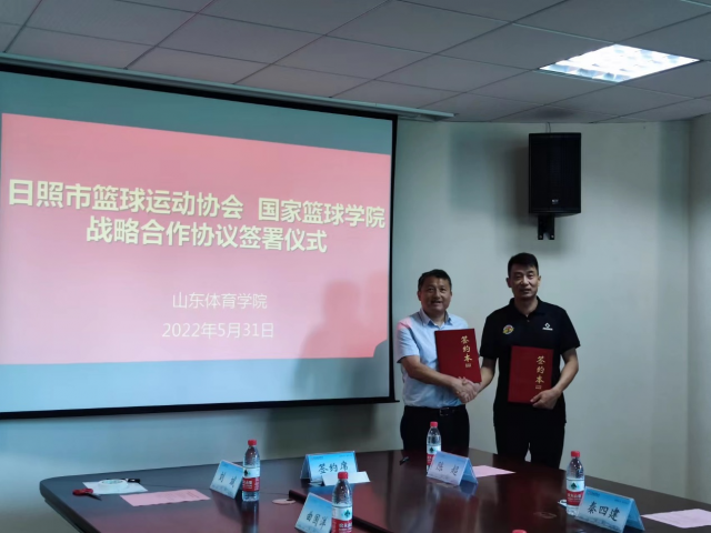 5月31日,国家篮球学院与日照市篮球运动协会战略合作协议签署仪式在日照校区培训楼4楼会议室举行。山东体育学院副院长、日照校区管委会主任、国家篮球学院副院长(主持日常工作)张疆之,国家篮球学院党总支副书记(主持工作)单涛,日照市篮球运动协会会长孔伟,日照市篮球运动协会副会长秦四建、谭成彬出席仪式。国家篮球学院业务部副主任曲国洋主持签约仪式。