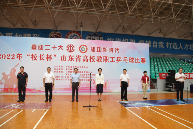 6月21日,由山东省教育工会委员会主办、山东体育学院承办的“喜迎二十大建功新时代”2022年“校长杯”山东省高校教职工乒乓球比赛在山东体育学院日照校区国家篮球学院训练馆隆重开幕。来自全省63所高校的64支代表队,包括93名校领导在内的552名运动员、教练员、领队等参加本次乒乓盛会。