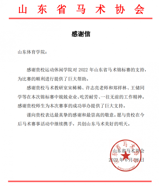 6月28日,山东省马术协会给山东体育学院发来感谢信。感谢我校对2022年山东省马术锦标赛的支持和运动休闲学院马术专业师生为比赛顺利进行提供的巨大帮助。