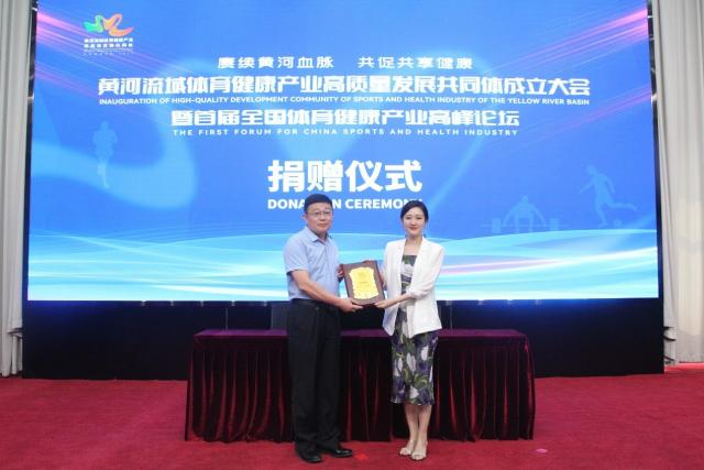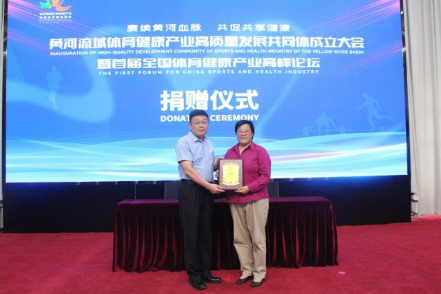 山东体育学院党委委员、副院长孙乐为为中大体育产业集团有限公司董事长徐美芳女士颁发“支持单位铭牌”