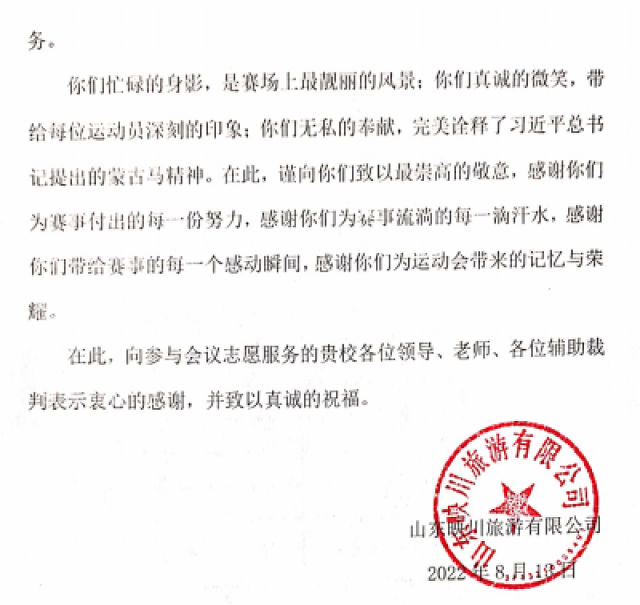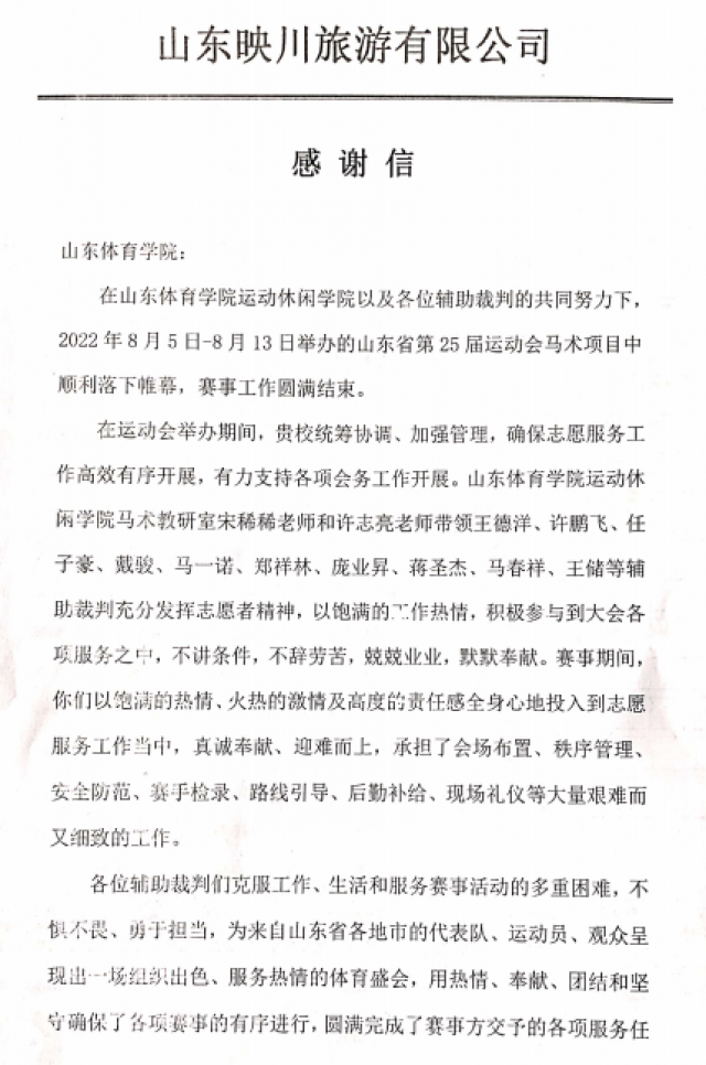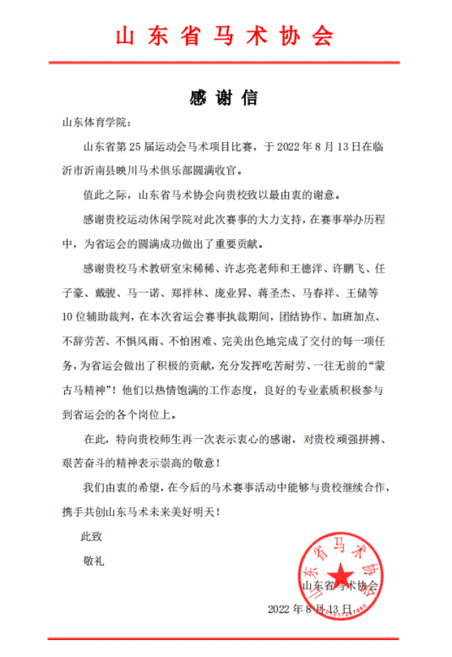 近日,山东省马术协会、山东映川旅游有限公司给山东体育学院发来感谢信,感谢我校对山东省第25届运动会马术项目比赛的支持和运动休闲学院马术专业师生为比赛顺利进行提供的巨大帮助。