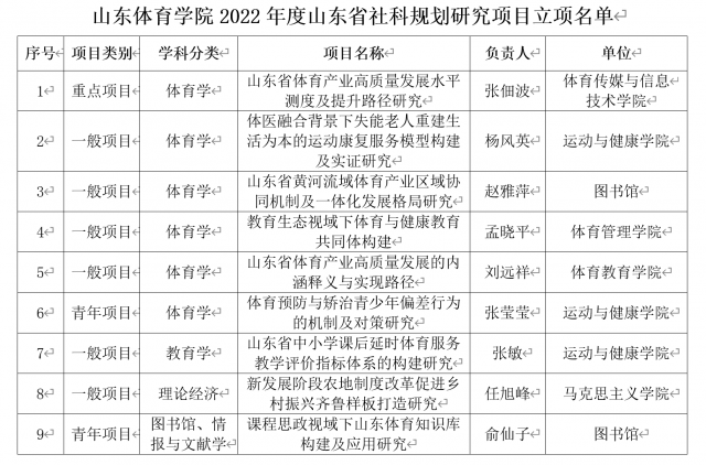 近日,山东省哲学社会科学工作办公室正式公布了2022年度山东省社科规划研究项目立项名单。经过通讯初评、会议评审,共评选出拟立项项目590项,其中年度项目558项、研究专项32项。我校9个项目获批立项,其中重点项目1项、一般项目6项、青年项目2项,立项率达50%。