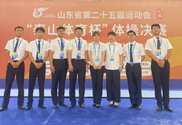 张瑞(左4)、姜芸(右4)、杨士坤(左3)是山东体育学院体育教育学院的优秀毕业生,三人在校时就开始锻炼裁判能力,现在已经成长为优秀的体操裁判员,张瑞和姜芸已经成为国家级裁判。