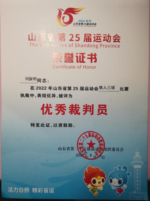 刘振明, 山东体育学院体育教育学院田径教研室教师,在山东省第二十五届运动会比赛中担任铁人三项全部组别的技术官员,执裁过程中,严格执行组委会要求,遵守各项规定,认真履行裁判工作职责,优良的业务能力和职业素质得到组委会和各参赛单位好评,并获得优秀裁判员的荣誉称号。