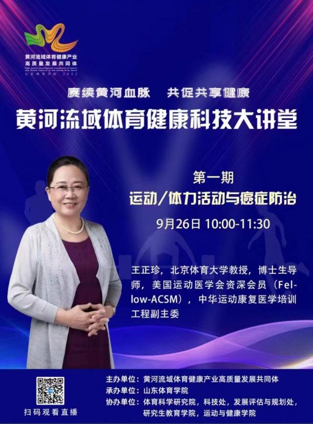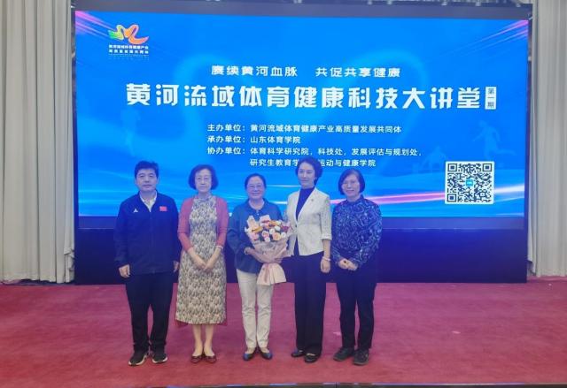 2022年9月26日,由黄河流域体育健康产业高质量发展共同体主办,黄河流域体育健康科技大讲堂第一期在山东体育学院举办。大讲堂以推动学科交叉融合,传递体育科研最新资讯,普及运动健康知识为目标,加强沿黄九省区的科研院所、运动康复医疗机构、行业协会和体育健康领域的企业集团等多家单位的体育健康学术交流,共促共享健康。本期邀请了北京体育大学王正珍教授,主题为规律运动/体力活动与癌症防治,山东体育学院院长毛莉虹、副院长李新、运动与健康学院院长隋波出席参加,沿黄九省区40多家单位人员参与了线上线下交流,体育科学研究院执行院长田雪文教授主持讲座。