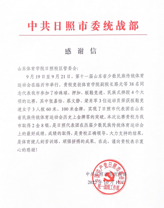 近日,中共日照市委统战部向我校日照校区发来感谢信,对竞技体育学院副院长路光及教练员陈东燕、黄军、郑冬冬等38名同志代表日照市在第十一届山东省少数民族传统体育运动会上取得的优异成绩表示衷心感谢。
