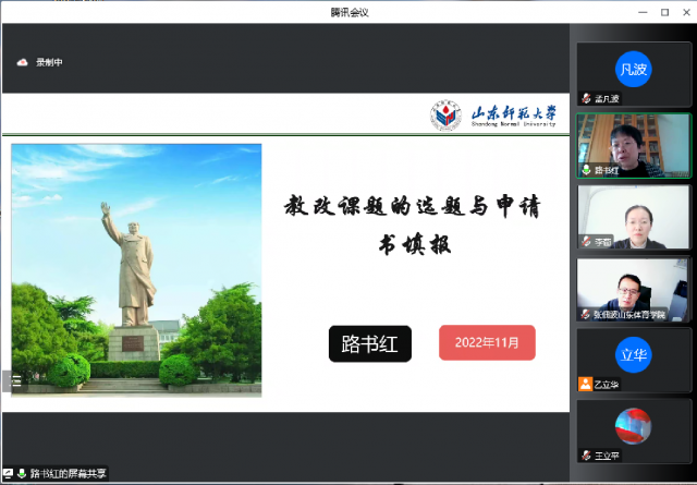 为进一步推动我校教育教学改革与研究,帮助广大教师提高教育教学研究能力,提升教学改革研究项目的申报与撰写水平,做好我校各级各类教学改革研究项目的申报工作,11月1日下午,学校邀请山东师范大学教育学部路书红教授开展“教学改革研究项目申报与撰写”专题讲座。本次讲座采用线上方式开展,党委委员、副院长兼教务处处长张佃波参加讲座,各教学单位教师以及教务处相关人员等80余人在线参加了讲座。教务处副处长李荀主持会议。