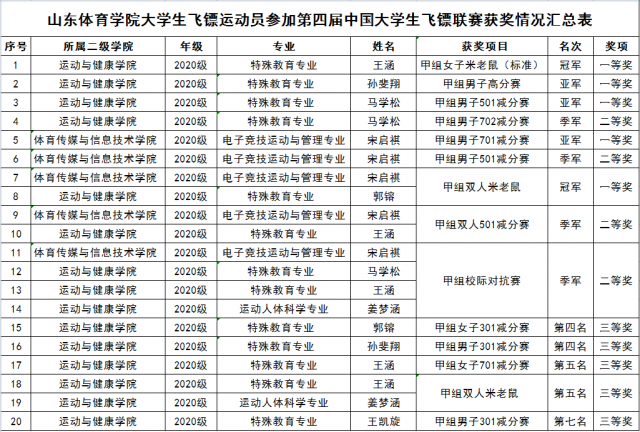 来自全国47所高校的790名运动员和31名教师运动员参与本次赛事角逐。我校22名大学生运动员参加此次比赛,收获甲组团体总积分第一名、甲组双人米老鼠冠军、甲组校际对抗赛季军、双人501减分赛季军的好成绩。在个人项目中,获冠军2项、亚军3项、季军4项、第四名2项、第五名2项、第7名1项。运动与健康学院团总支书记、飞镖协会指导教师王凌菲担任赛事主教练。