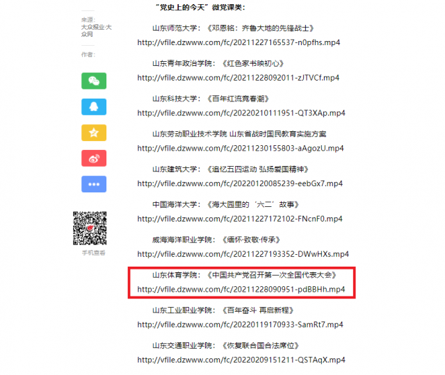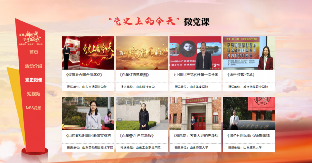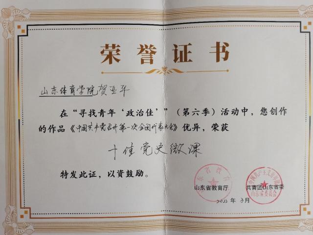 近日,由山东省委宣传部、省教育厅、团省委主办的“逐梦新时代学习正当时——寻找青年‘政治佳’(第六季)活动”获奖作品正式面向社会公示,我校推荐报送的参赛作品荣获十佳微党课,这是我校首次荣获此项评选活动奖项。参赛获奖作品是以“党史上的今天”为主题的党史微课,作品名称是《中国共产党召开第一次全国代表大会》。该项获奖作品由党委宣传部贺亚平同志创作并完成微党课讲述。