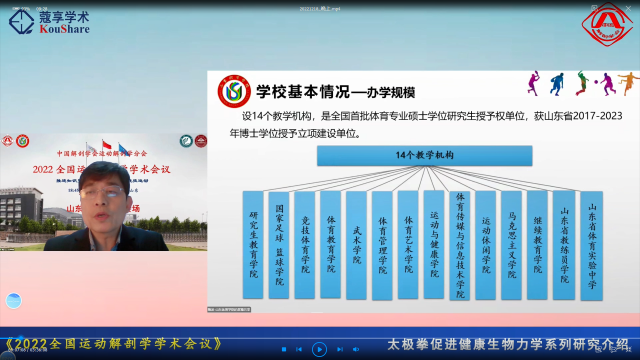 18日晚,山东体育学院运动与健康学院院长隋波主持山东体育学院分会场报告会。隋波院长首先介绍了山东体育学院概况,接着介绍了运动与健康学院的发展历程、学科专业、师资队伍、教学科研成果、教学条件、人才培养等基本情况,以及运动员医疗保障车的研发及应用、攻克高端体育装备研发关键核心技术等代表性成果,最后预祝本次大会圆满成功。山东体育学院原校长、新世纪千百万国家级人才、中国老年学和老年医学学会运动健康科学学会副主任委员毛德伟,国家体育总局体育科研所研究员、国家体育总局首批“优秀中青年专业技术人才百人计划”学者、体育总局2020东京奥运会训练监控组专家何子红,中国医科大学教授、中华放射学会骨关节学组副组长、中国解剖学会运动解剖学分会常委潘诗农,山东大学人体解剖与神经生物学系主任、中国解剖学会运动解剖学分会常委孙晋浩,华南师范大学教授、运动人体科学珠江学者岗位学术带头人、中国生物医学工程学会血液疗法与工程分会副主任委员刘承宜,依次作专家学术报告。