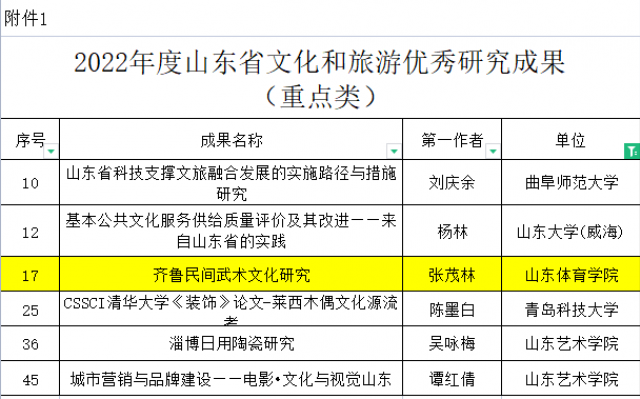 日前,山东省文化和旅游厅公布了2022年度山东省文化和旅游优秀研究成果入选名单,我校武术学院张茂林教授的《齐鲁民间武术文化研究》成功入选重点类成果。该成果为全省所有重点类成果中唯一的体育学科类成果。