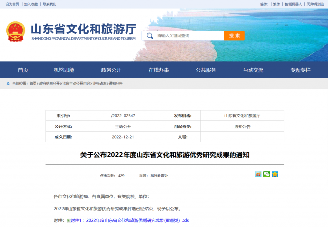 据悉,山东省文化和旅游优秀研究成果评选是省文旅厅为充分发挥研究成果对文化事业、文化产业和旅游业的驱动、引领、示范作用,重点项目分为黄河文化保护与传承研究、齐长城文化保护与传承研究、大运河文化保护与传承研究、山东红色文化赓续传承研究、文化旅游文物数字化保护利用研究等五个方向。本年度共评出重点成果50项,一般成果71项。