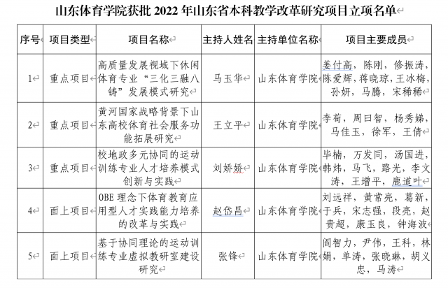 近日,山东省教育厅印发《关于公布2022年本科教学改革研究项目立项名单的通知》(鲁教高函〔2022〕37号),我校获批本科教学改革研究项目5项,其中重点项目3项(学校限额推荐2项、山东省普通本科高等学校体育教学指导委员会推荐1项)、面上项目2项(学校限额推荐2项)。3项重点项目全部获批立项,立项数量和质量均创历年新高,实现新突破。