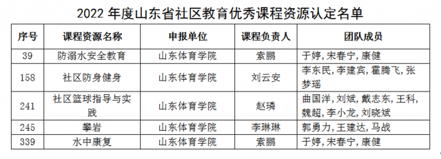 继2020年《“电脑颈”的预防与康复》《如何防治运动性伤病》《飞盘运动社区行、全民健康伴我赢——飞盘运动社区推广与应用》《运动促进健康的生物化学》《健身气功》《螳螂拳》6门课程之后,《防溺水安全教育》《社区防身健身》《社区篮球指导与实践》《攀岩》《水中康复》5门课程的成功入选是我校推动社区教育、助力“构建服务全民终身学习的教育体系”所取得的又一项重要成果。