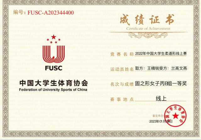 由中国大学生体育协会主办,成都体育学院承办的2022年中国大学生柔道形线上赛圆满结束。我校邱春艳、于滇两位老师带领12名学生参加,取得了2个一等奖、7个二等奖、2个三等奖、1个优秀奖的优异成绩。此次比赛为期9天,设甲组、乙组、丙组、丁组和师生组五个组别,包括投之形和固之形两个竞赛项目,比赛分竞赛视频提交和裁判在线评审两个阶段进行。