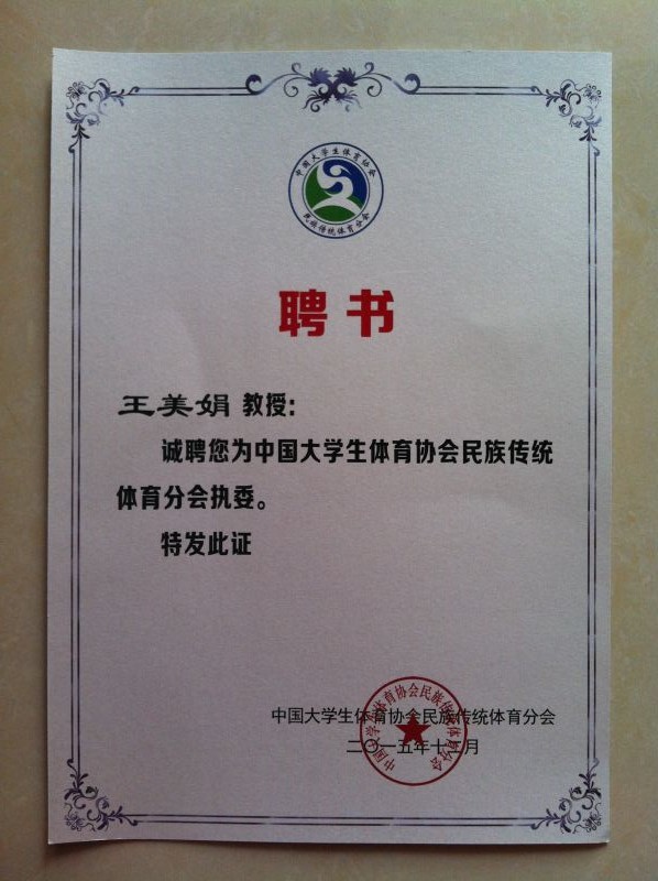 12月25—27日,中国大学生体育协会民族传统体育分会、跆拳道分会常务理事及专业委员会责任人会议暨2015年年会在广州召开。会上,我校武术系主任王美娟教授当选为中国大学生体育协会民族传统体育分会执委。