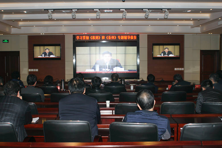 12月24日下午,我校组织党员领导干部集体观看了监察部副部长王令浚在省委理论学习中心组辅导报告会上所作的《学习贯彻〈准则〉和〈条例〉专题辅导报告》视频。党委书记王毅,党委副书记、院长韩冬,党委副书记、纪委书记张云龙及副院长张艳霞、谷忠德、原维佳、毛莉虹、毛德伟以及全校100余名副处级以上党员干部参加了学习。