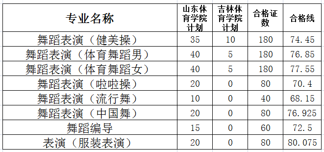 2.健美操方向、体育舞蹈方向按照山东体育学院和吉林体育学院招生计划数之和1:4发放合格证;