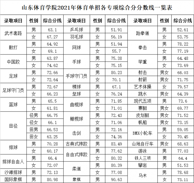 2021年山东体育学院运动训练专业文化最低录取控制线为220分;