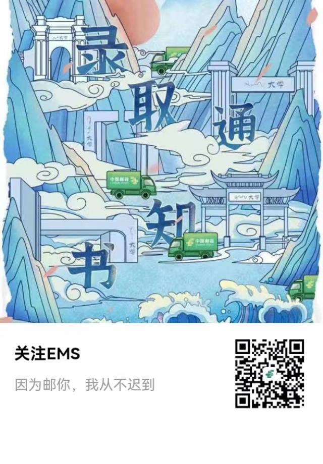 关注“EMS中国邮政速递物流”微信公众号,点击高考录取通知书查询,支持考生号、快递单号查询。