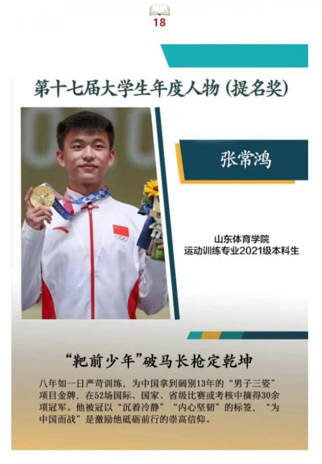 张常鸿是我校运动训练专业2021级本科学生,国际级运动健将,中国射击选手。张常鸿在2020年东京奥运会上,为中国拿到阔别13年的“男子三姿”项目金奖,在52场国际、国家、省级比赛或考核中摘得30余项冠军。(张懿范)