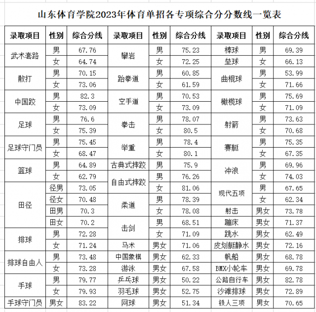 2023年山东体育学院运动训练专业文化最低录取控制线为230分;