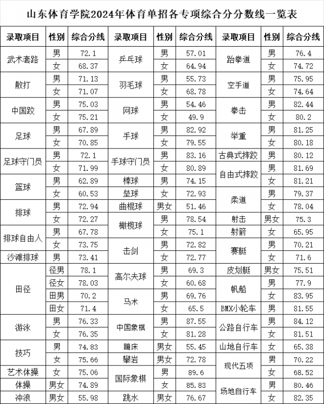 2024年山东体育学院运动训练专业(其他项目)文化最低录取控制线为215分;