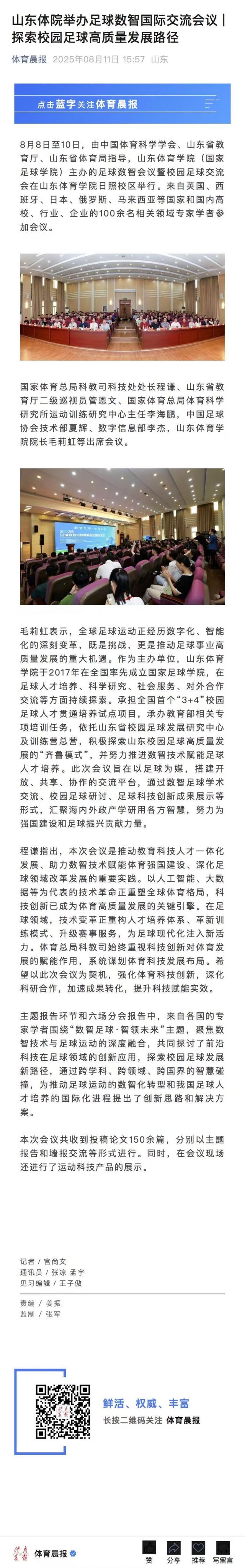 【体育晨报】山东体院举办足球数智国际交流会议 | 探索校园足球高质量发展路径