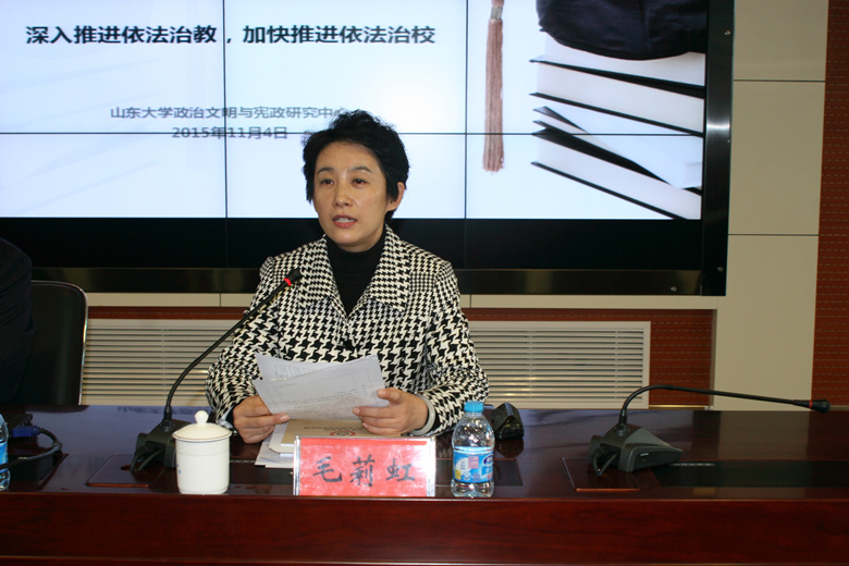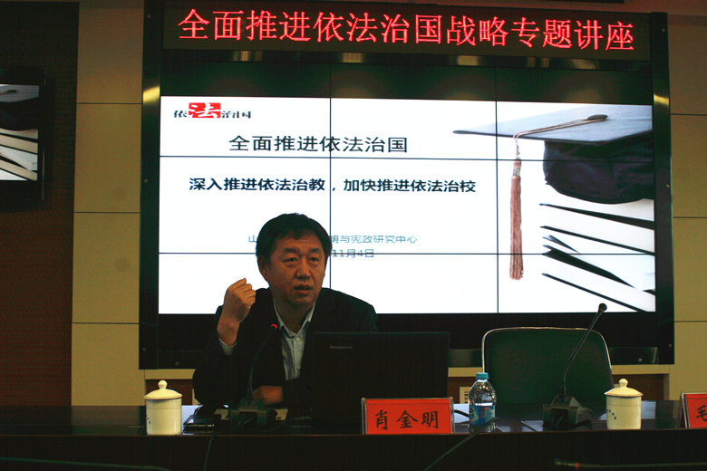 肖金明教授深入讲解了依法治国的重大意义,指出,依法治国、依法治教、依法治校一脉相承,要从党内法治、国家法治和社会法治三方面全面推进依法治国的建设;要从依法治理运动、依法行政原则和依法治教要求深入体会依法治教是深入推进依法行政的具体体现;从基本理念、制度基础和基本路径深入理解依法治校是加快推进社会治理创新的表现。他强调,要深刻把握依法治校的精神内涵,从依法治国的高度理解依法治校,从深入推进依法行政把握依法治校的条件,从加快建设大学章程寻求依法治校的路径。依法治校的关键是依法治官、依法治权,构建以章程为核心的现代大学制度体系,重构大学政治、行政、学术、民主关系,完善大学治理过程。依法治校要与推进高校综合改革、民主科学依法推进改革相结合;与制定“十三五”规划、推进民主科学依法决策相结合;与加强高校反腐败工作,依法依规推进廉政建设相结合。